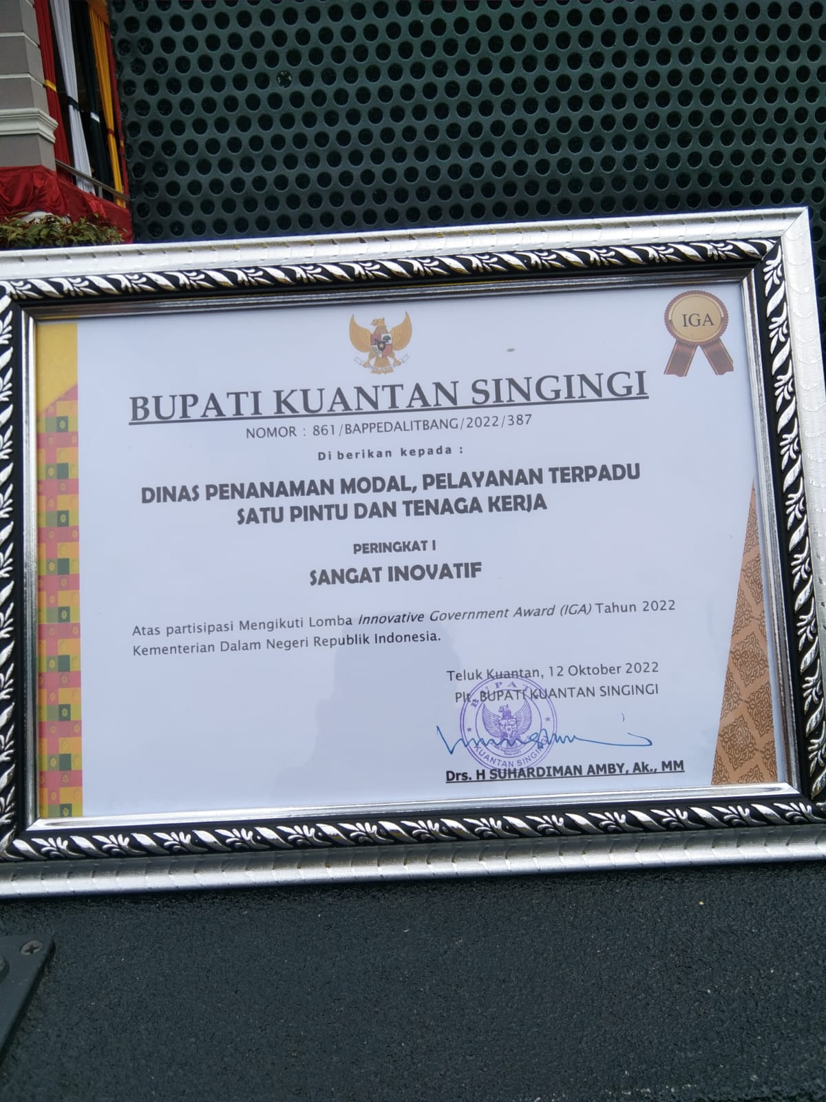 DPMPTSPTK mendapatkan Peringkat I Sangat Innovatif atas partisipasi mengikuti lomba Innovative Government Award (IGA) tahun 2022 Kementerian dalam Negeri Republik Indonesia