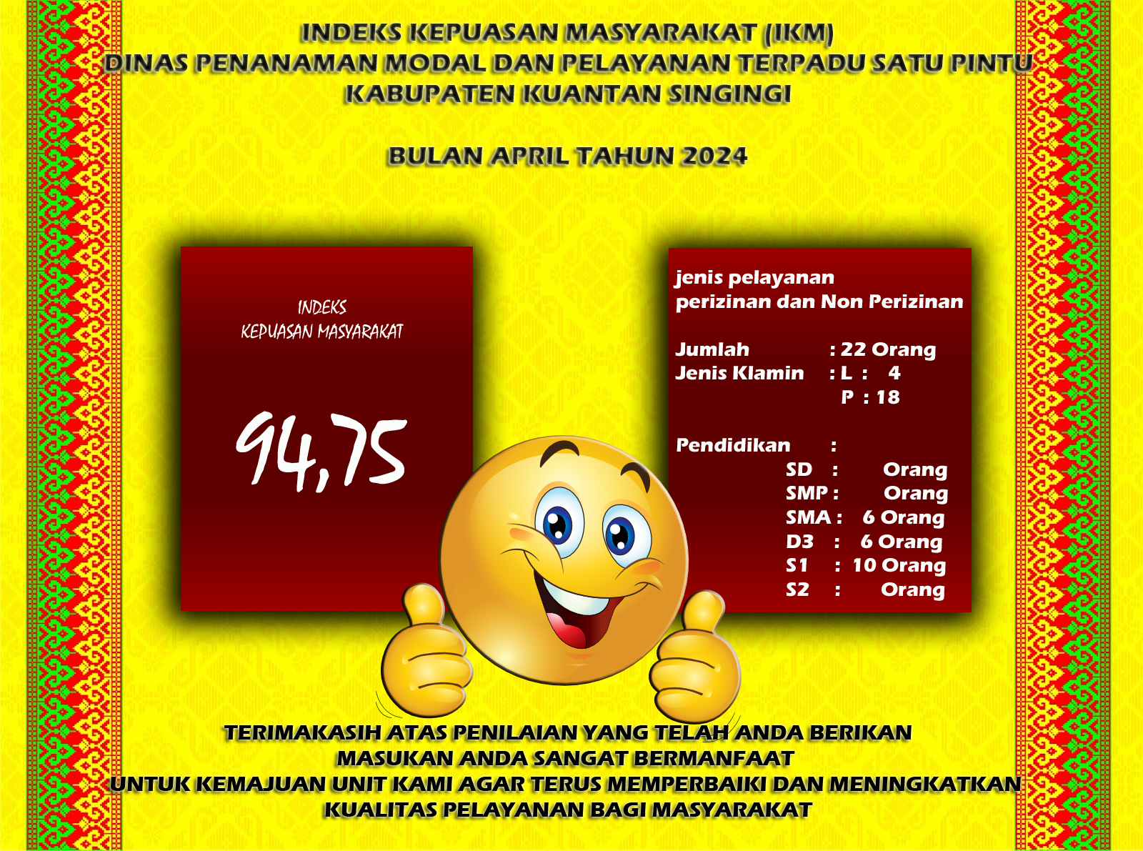 Indeks Kepuasan Masyarakat (IKM) bulan April Tahun 2024 DPMPTSP Kab. Kuantan Singingi