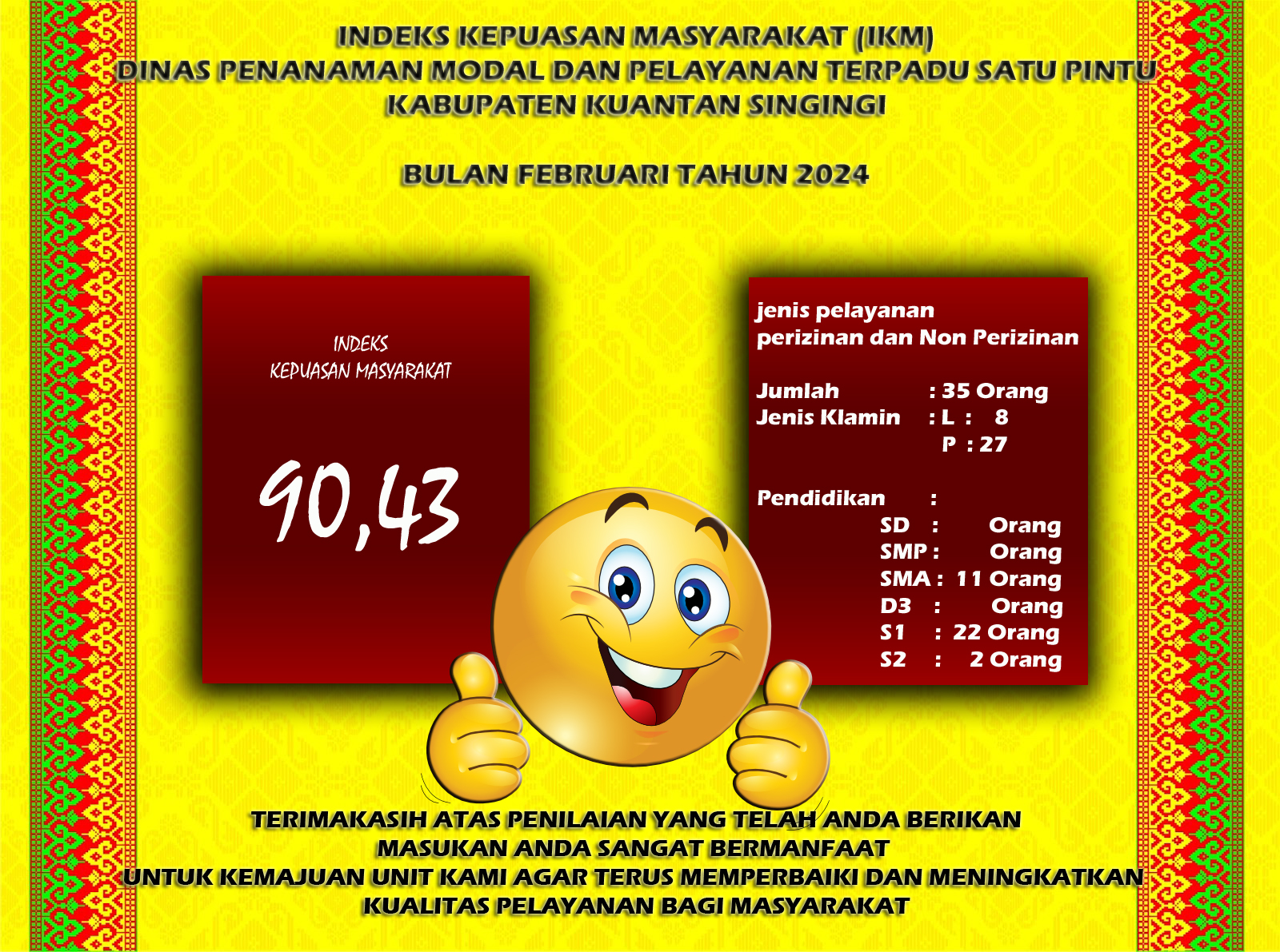 Indeks Kepuasan Masyarakat (IKM) bulan Februari Tahun 2024 DPMPTSP Kab. Kuantan Singingi