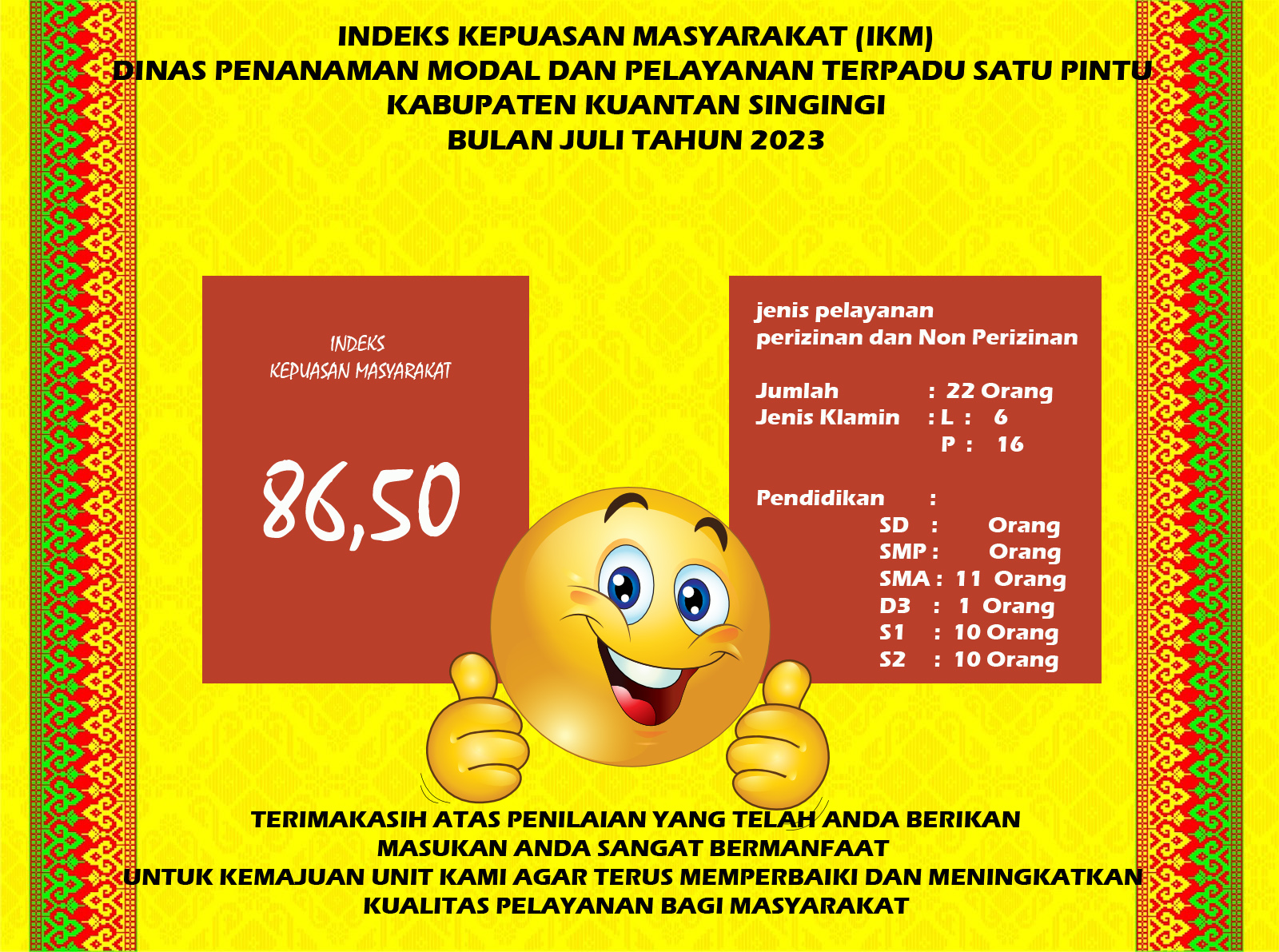 Indeks Kepuasan Masyarakat (IKM) bulan Juli Tahun 2023 DPMPTSP Kab. Kuantan Singingi