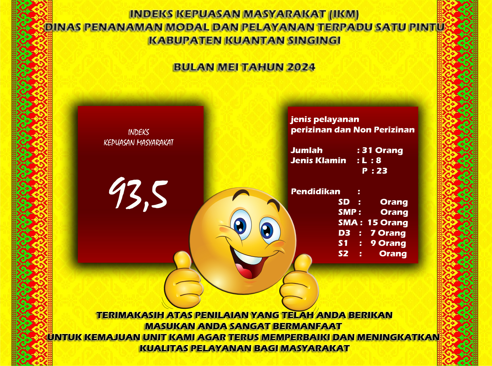 Indeks Kepuasan Masyarakat (IKM) bulan Mei Tahun 2024 DPMPTSP Kab. Kuantan Singingi