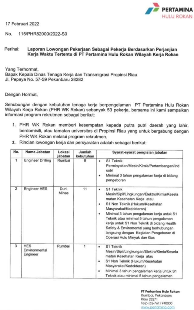Info Lowongan Pekerjaan di PT. Pertamina Hulu Rokan