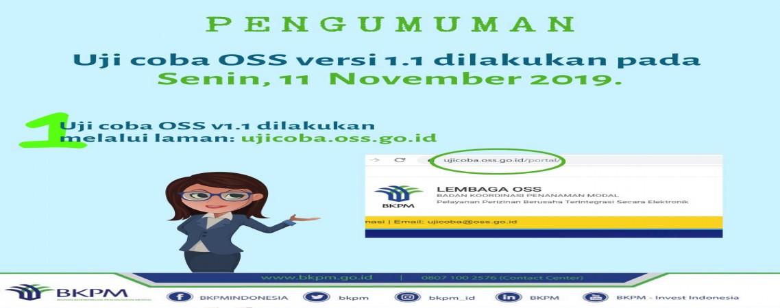 Kepada seluruh Pelaku Usaha bersama ini kami beritahukan bahwa kami akan melakukan uji coba OSS v1.1 mulai Senin, 11 November 2019. Sehubungan dengan hal tersebut dapat kami sampaikan hal-hal sebagai berikut :